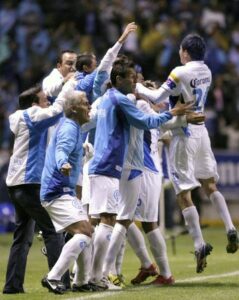 Foto de archivo de jugadores de Puebla celebrando un gol en partido del torneo mexicano. Estadio Cuauhtémoc, Puebla, México. 13 de mayo de 2009.