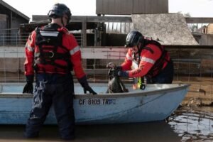 Members of the Merced County Technical Rescue Team help evacuate a turkey from a flooded farm after winter storms brought high winds and heavy rain in Atwater, California, U.S. January 12, 2023. REUTERS/Laure Andrillon