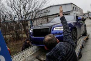 Romanian officials transport the cars seized from Andrew Tate’s compound to a storage location in Pipera, Ilfov, Romania, January 14, 2023. Inquam Photos/Octav Ganea via REUTERS