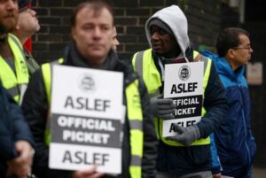 FILE PHOTO: Rail workers that are members of the ASLEF union stand at a picket line outside Euston station while on strike, in London, Britain, January 5, 2023. REUTERS/Henry Nicholls/File Photo