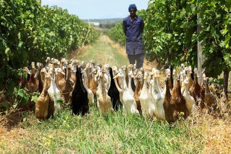 STELLENBOSCH, South Africa (Reuters) – Flocks of white, black and brown ducks hunt for snails and bugs as they patrol the grapevines at a vineyard in South Africa’s winemaking town of Stellenbosch, helping the owners steer clear of pesticides and synthetic fertilisers.