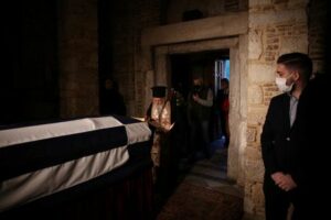 A Greek Orthodox priest pays his respects to former King of Greece Constantine II at Saint Eleftherios chapel, where he lies at rest before the funeral service, in Athens, Greece, January 16, 2023. REUTERS/Alkis Konstantinidis