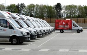 FILE PHOTO: Delivery vans lined up prior to dispatch at the Ocado CFC (Customer Fulfilment Centre) in Andover, Britain May 1, 2018. REUTERS/Peter Nicholls/File Photo