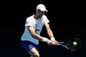 Jan 12, 2023; Melbourne, Victoria, Australia; Novak Djokovic of Serbia hits a backhand during a practice session on Rod Laver Arena with his coach Goran Ivanisevic at Melbourne Park. Mandatory Credit: Mike Frey-USA TODAY Sports