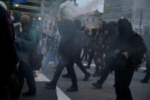 Protestors hold signs and march during demonstrations related to the death of Manuel Teran who was killed during a police raid inside Weelaunee People’s Park, the planned site of a controversial “Cop City” project, in Atlanta, Georgia, U.S., January 21, 2023. REUTERS/Cheney Orr