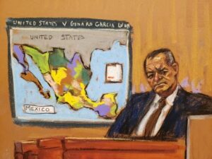“El grande” testifies during the trial of Mexico’s former Public Security Minister Genaro Garcia Luna on charges that he accepted millions of dollars to protect the powerful Sinaloa Cartel, once run by imprisoned drug lord Joaquin “El Chapo” Guzman, at a courthouse in New York City, U.S., January 23, 2023 in this courtroom sketch. REUTERS/Jane Rosenberg