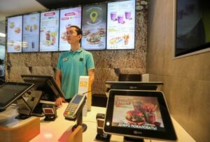 An employee waits for customers at a fast food restaurant, which used to operate under the McDonald’s brand and reopened with no branding weeks after the U.S. company left the local market, in Almaty, Kazakhstan January 23, 2023. REUTERS/Pavel Mikheyev