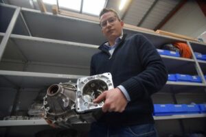 FILE PHOTO: John Bond, commercial manager of motorsport engine maker Swindon Powertrain, holds a part of an e-axle the company has developed, to help low-volume vehicle manufacturers make the transition to electric in Swindon, Britain, November 2, 2022. REUTERS/Nick Carey
