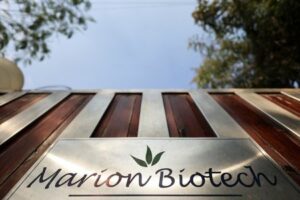 FILE PHOTO: Logo of Marion Biotech, a healthcare and pharmaceutical company is seen on a gate outside their office in Noida, India, December 29, 2022. REUTERS/Anushree Fadnavis