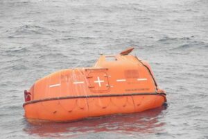 A life boat drifts at sea near the site of a cargo ship that sank off southwestern Japan in this handout image released on January 25, 2023. Courtesy of 7th Regional Coast Guard Headquarters – Japan Coast Guard/Handout via REUTERS