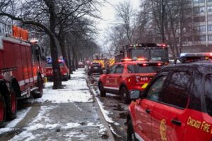 A view shows the vehicles of Chicago Fire Department as fire fighters work to contain a deadly apartment building blaze in the Kenwood neighborhood of Chicago, Illinois, U.S. January 25, 2023. REUTERS/Jim Vondruska