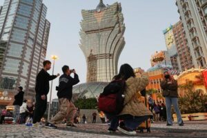 Visitors pose for photos outside the Grand Lisboa casino operated
