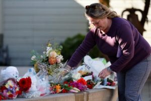 Half Moon Bay resident Elisabeth Olander, 68, places flowers at a memorial for shooting victims at Mac Dutra Park in Half Moon Bay, California, U.S., January 25, 2023. REUTERS/Fred Greaves