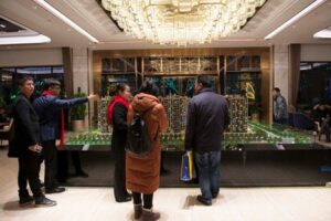 FILE PHOTO: People stand in front of residential building models at a Country Garden property showroom in Huaian, Jiangsu province, China December 10, 2017. Picture taken December 10, 2017. REUTERS/Stringer
