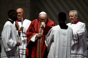 Pope Francis presides the Good Friday Passion of the Lord service in Saint Peter’s Basilica at the Vatican, April 7, 2023. REUTERS/Guglielmo Mangiapane