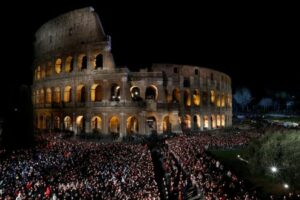 People attend the Via Crucis (Way of the Cross) procession during Good Friday celebrations at the Colosseum, which Pope Francis follows from Casa Santa Marta at the Vatican due to the intense cold, in Rome, Italy April 7, 2023. REUTERS/Remo Casilli
