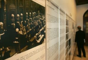 FILE PHOTO: A visitor reads a board at an exhibition, before a ceremony to commemorate the 60th anniversary of the beginning of the Nuremberg trials following World War Two, in Nuremberg November 19, 2005. REUTERS/Alexandra Winkler