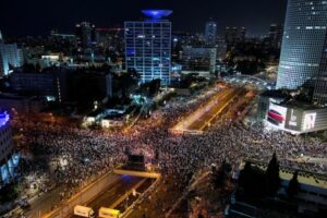 La gente se manifiesta contra el primer ministro israelí, Benjamin Netanyahu, y la revisión judicial de su gobierno de coalición nacionalista, en Tel Aviv, Israel. 8 de abril, 2023. REUTERS/Ilan Rosenberg