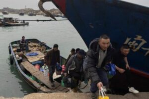 Chinese fishermen leave a boat that shuttled them from their vessel after a day of work in the Taiwan Strait, in a harbour on Pingtan Island, Fujian province, China, April 7, 2023. REUTERS/Thomas Peter