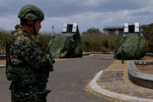 Un soldado cerca de los lanzamisiles móviles Hsiung Feng en el parque cabo Maobitou, en el condado de Pingtung, Taiwán. 10 de abril de 2023. REUTERS/Ann Wang