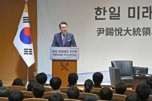 FILE PHOTO: South Korea’s President Yoon Suk Yeol delivers a speech to students at Keio University in Tokyo, Japan March 17, 2023, in this photo released by Kyodo. Mandatory credit Kyodo via REUTERS