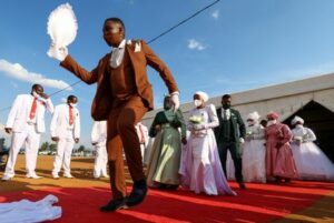 A groom dances as he is followed by some of the more than 800 couples taking part in the Easter Sunday mass wedding ceremony, organised by the International Pentecostal Holiness Church Jerusalem City (IPHC), in Kgabalatsane, in the North-West province, South Africa, April 9, 2023. REUTERS/Siphiwe Sibeko