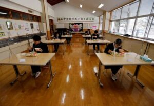 FILE PHOTO: Eita Sato, 15, and Aoi Hoshi, 15, the only two students at Yumoto Junior High School, have their last school lunch with their teachers before their graduation and the institution’s closing ceremony, Fukushima Prefecture, Japan, March 9, 2023. REUTERS/Issei Kato/File Photo