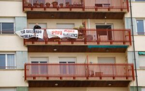 FILE PHOTO: A man ties protest banners in the balcony of a building that was recently converted for tourist use at Sants neighborhood in Barcelona, Spain, May 19, 2023. The banner reads “No more tourist flats”. REUTERS/Albert Gea