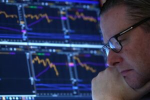 A trader work on the floor of the NYSE in