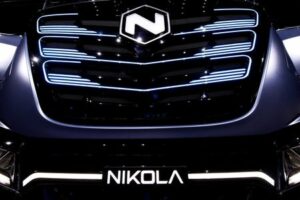 FILE PHOTO: U.S. Nikola’s logo is pictured at an event held to present CNH’s new full-electric and Hydrogen fuel-cell battery trucks in partnership with U.S. Nikola event in Turin, Italy, December 3, 2019. REUTERS/Massimo Pinca