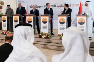FILE PHOTO: Bahrain’s Foreign Minister Abdullatif bin Rashid al-Zayani, Egypt’s Foreign Minister Sameh Shoukry, Israel’s Foreign Minister Yair Lapid, U.S. Secretary of State Antony Blinken, Morocco’s Foreign Minister Nasser Bourita, and United Arab Emirates’ Foreign Minister Sheikh Abdullah bin Zayed Al Nahyan, attend a news conference during the Negev Summit, in Sde Boker, Israel March 28, 2022. Jacquelyn Martin/Pool via REUTERS/File Photo