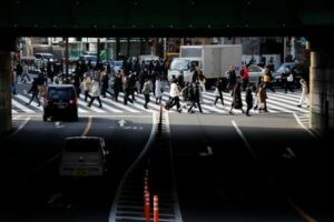 FILE PHOTO: People wearing protective face masks walk on a pedestrian crossing, amid the coronavirus disease (COVID-19) pandemic, in Tokyo, Japan January 19, 2022. REUTERS/Issei Kato