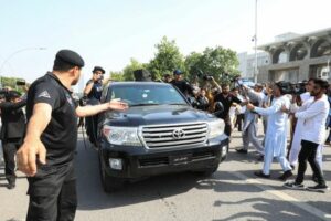A vehicle carrying Pakistan’s former Prime Minister Imran Khan drives outside the High Court in Islamabad, Pakistan, June 8, 2023. REUTERS/Fayaz Aziz