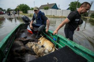 Volunteers evacuate dogs, previously sedated, from a flooded area after the Nova Kakhovka dam breached, amid Russia’s attack on Ukraine, in Kherson, Ukraine June 7, 2023. REUTERS/Vladyslav Musiienko