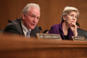 U.S. Senator Chris Van Hollen (D-MD) and U.S. Senator Elizabeth Warren (D-MA) attend a Senate Banking, Housing and Urban Affairs Committee hearing on Capitol Hill in Washington, U.S., April 18, 2023. REUTERS/Amanda Andrade-Rhoades/File Photo