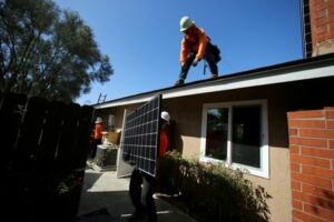 FILE PHOTO: Workers lift a solar panel onto a roof during a residential solar installation in Scripps Ranch, San Diego, California, U.S. October 14, 2016. Picture taken October 14, 2016. REUTERS/Mike Blake/File Photo