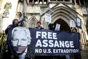 FILE PHOTO: Supporters of Julian Assange display signs and a banner, outside the Royal Courts of Justice in London, Britain December 10, 2021. REUTERS/Henry Nicholls