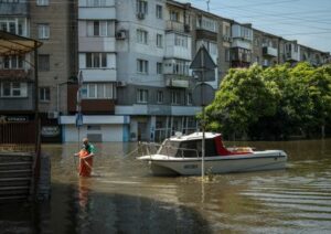 A man moors a boat at a flooded street during an evacuation from a flooded area after the Nova Kakhovka dam breached, amid Russia’s attack on Ukraine, in Kherson, Ukraine June 9, 2023. REUTERS/Vladyslav Musiienko