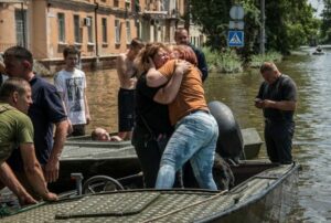 Local residents react after evacuation from a flooded area after the Nova Kakhovka dam breached, amid Russia’s attack on Ukraine, in Kherson, Ukraine June 9, 2023. REUTERS/Vladyslav Musiienko