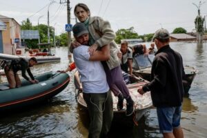 Volunteers evacuate local residents from a flooded area after the Nova Kakhovka dam breached, amid Russia’s attack on Ukraine, in Kherson, Ukraine June 8, 2023. REUTERS/Alina Smutko