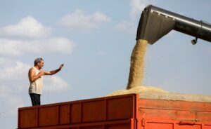 FILE PHOTO: A worker stands on the top of a truck as a combine loads grain during barley harvesting in a field owned by Sabynin agricultural enterprise near the settlement of Krymgireyevskoye in Stavropol Region, Russia July 11, 2020.REUTERS/Eduard Korniyenko/File Photo