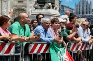 FILE PHOTO: People gather outside the Duomo Cathedral on the day of the funeral of former Italian Prime Minister Silvio Berlusconi, in Milan, Italy June 14, 2023. REUTERS/Claudia Greco/File Photo