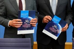 German Chancellor Olaf Scholz and Defence Minister Boris Pistorius hold documents as they attend a press conference on the day they present the national security strategy during a press conference at the House of ‘Bundespressekonferenz’ in Berlin, Germany June 14, 2023. REUTERS/Fabrizio Bensch
