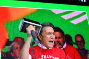 Tekin Nasikkol, head of the works council of Thyssenkrupp Steel Europe, holds up a steel hammer as he speaks to steel workers of Thyssenkrupp, on the day of protests by the German IG Metall union, in front of the Thyssenkrupp steel plant in Duisburg, Germany, June 14, 2023. REUTERS/Wolfgang Rattay