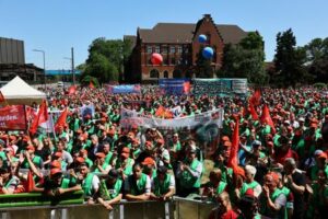 Steel workers of Thyssenkrupp gather during protests by the German IG Metall union, in front of the Thyssenkrupp steel plant in Duisburg, Germany, June 14, 2023. REUTERS/Wolfgang Rattay