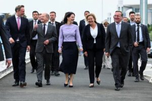 German Chancellor Olaf Scholz walks with Foreign Minister Annalena Baerbock, Finance Minister Christian Lindner, Interior Minister Nancy Faeser and Defence Minister Boris Pistorius on the day they present the national security strategy during a press conference at the House of ‘Bundespressekonferenz’ in Berlin, Germany June 14, 2023. REUTERS/Annegret Hilse