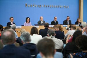 German Chancellor Olaf Scholz along with Foreign Minister Annalena Baerbock, Finance Minister Christian Lindner, Interior Minister Nancy Faeser and Defence Minister Boris Pistorius attend a press conference on the day they present the national security strategy, at the House of ‘Bundespressekonferenz’ in Berlin, Germany June 14, 2023. REUTERS/Annegret Hilse