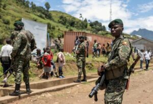 FOTO DE ARCHIVO: Miembros del ejército ugandés, parte de las tropas de la Fuerza Regional de la Comunidad de África Oriental (EACRF), patrullan un asentamiento cedido por los combatientes rebeldes del M23 a los soldados de la EACRF en Bunagana, territorio de Rutshuru de la provincia de Kivu del Norte de la República Democrática del Congo. 19 de abril, 2023. REUTERS/Arlette Bashizi/Archivo