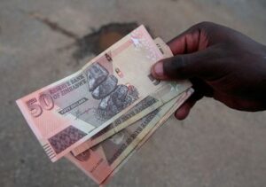 FILE PHOTO: A man shows off Zimbabwean currency notes outside a grocery store in Harare, Zimbabwe, March 17, 2022. REUTERS/Philimon Bulawayo/File Photo
