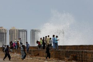 People gather near the rising waves, before the arrival of the cyclonic storm, Biparjoy, over the Arabian Sea, at Clifton Beach, in Karachi, Pakistan June 13, 2023. REUTERS/Akhtar Soomro